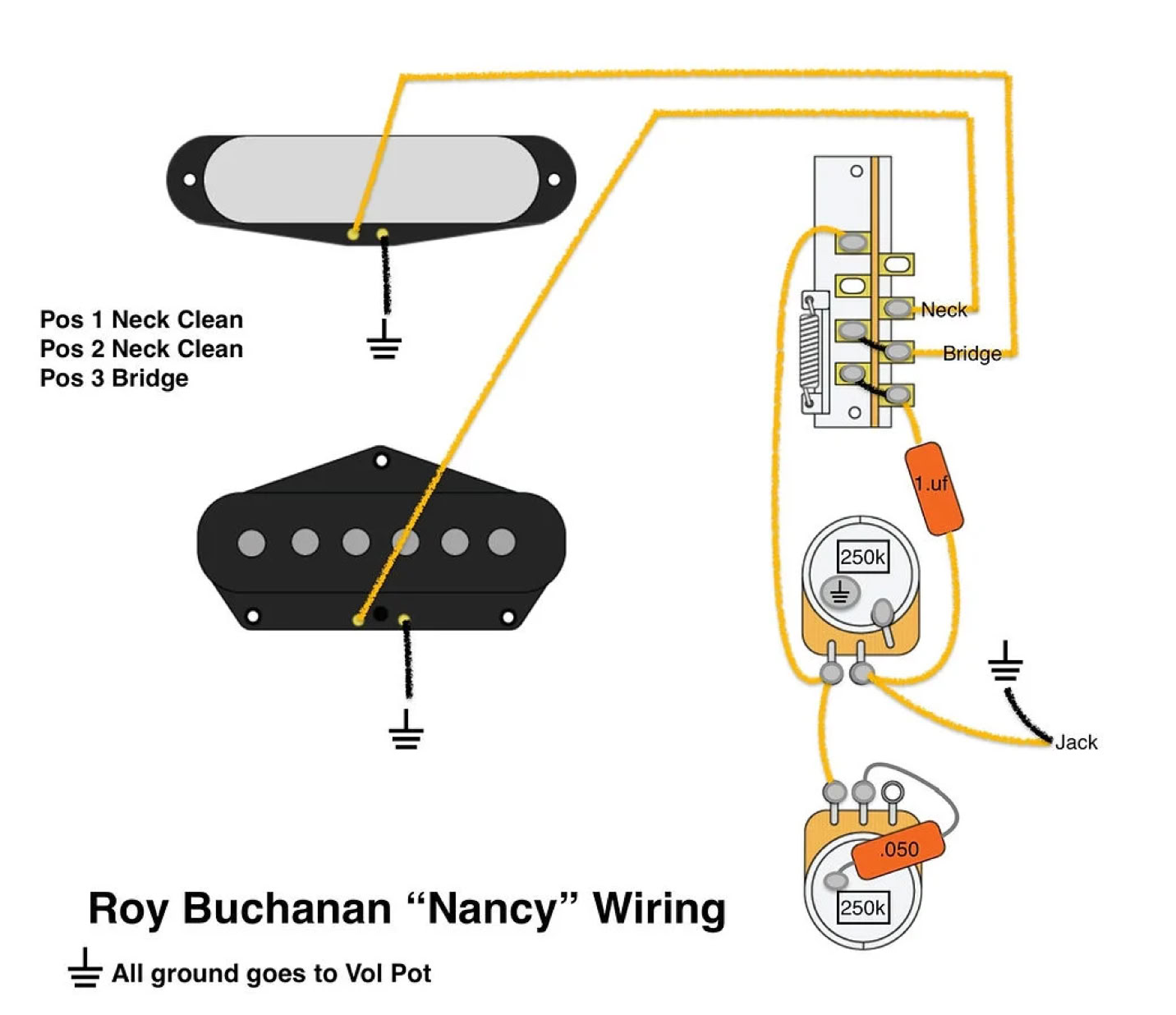 Also he had a .1 uf capacitor in series to the neck at both pos. 1 & 2.. This cap would brighten up things even further.
