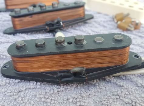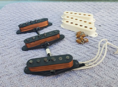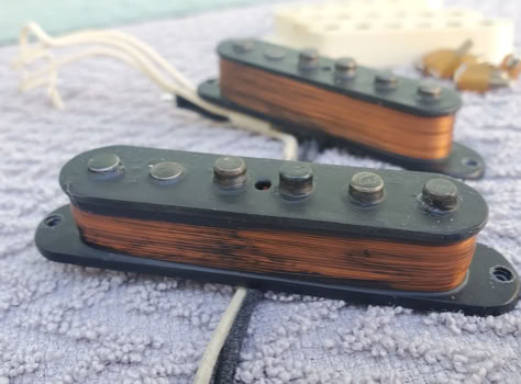 I have been eyeballing pickups from Sarah Marie Holly for a while. So i finally bit the bullet and ordered some. The wife and husband team Holly´s sells old trinkets on Ebay and our mysterious miss Holly has a knack of winding old-looking pickups by using only 50’s methods of making pickups. Everything from winding technique, wire, laquered magnets and potting is done the old way. And the aging is so good that you will have a hard time telling them apart.