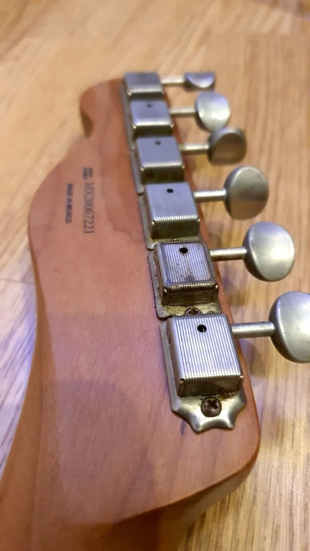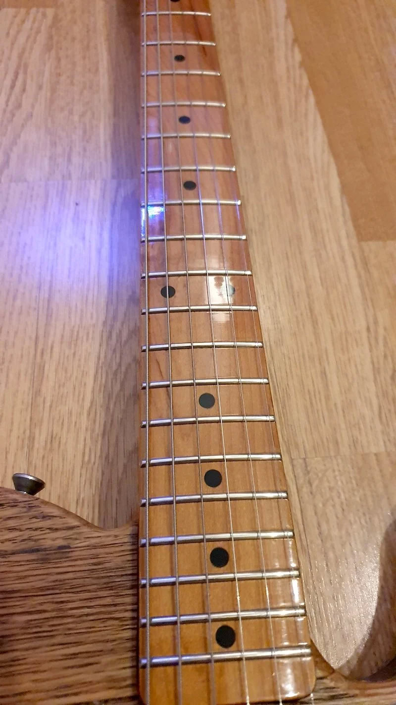 For the neck i instantly thought about the roasted maple necks. Thought they would go great with that body. A Vintera neck was acquired with a lacquered fretboard and a satin back. I decided not to do any relic work on the neck (How do you relic a roasted neck anyway?) It looks "Old" at a glance but i will let time age this beauty.