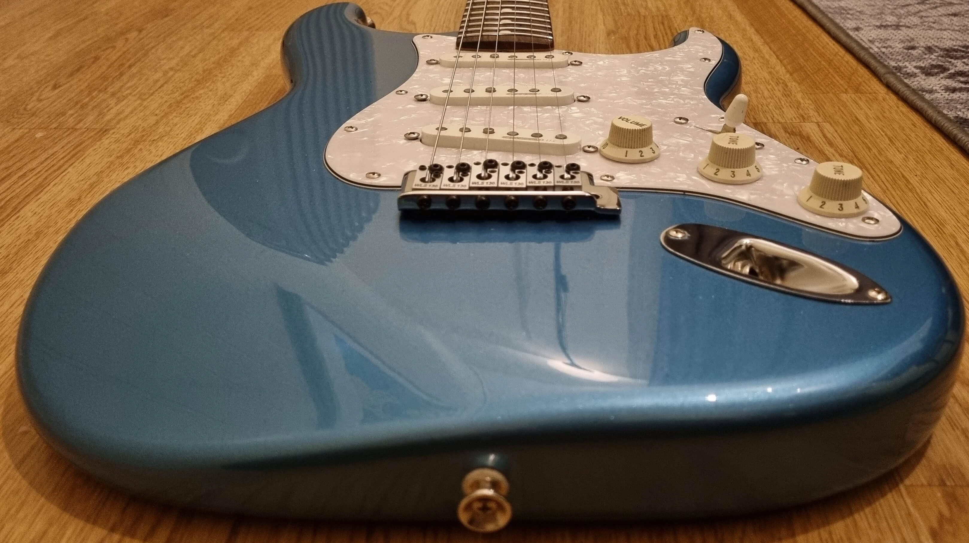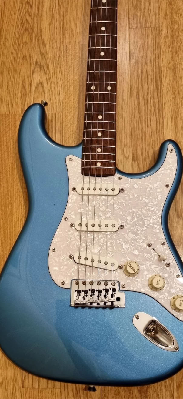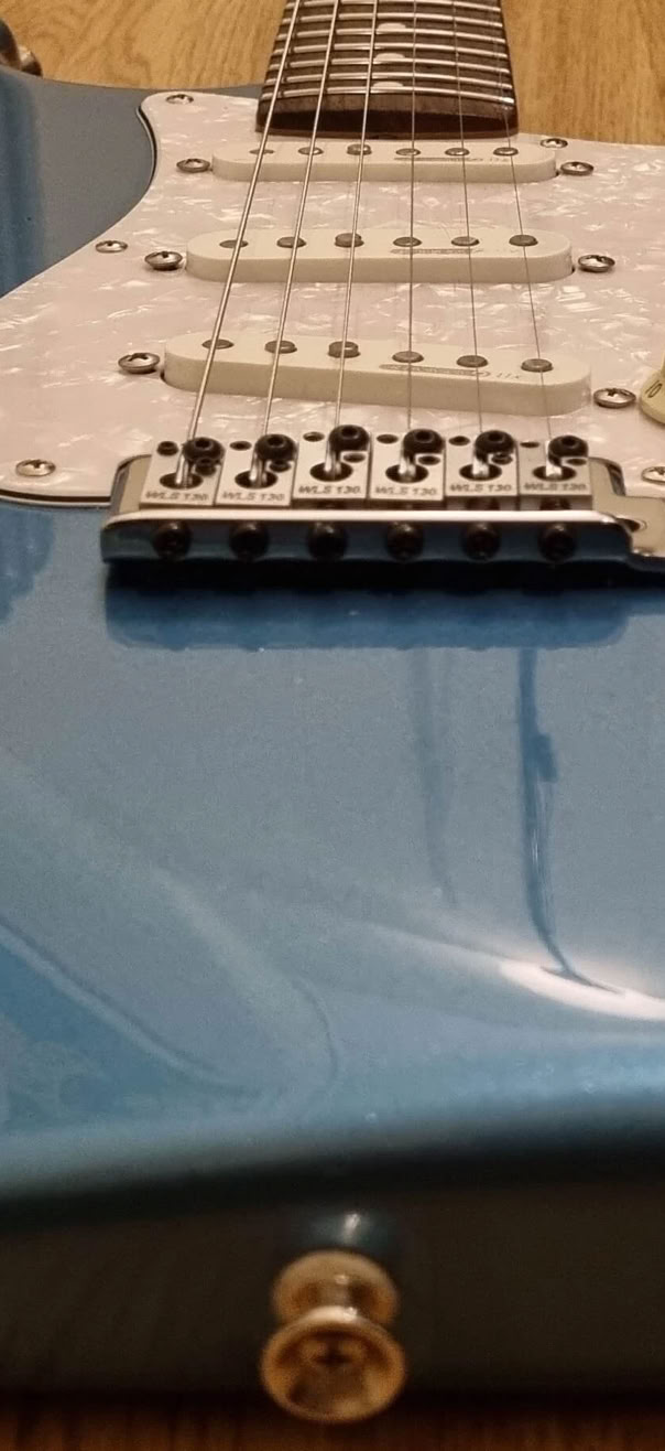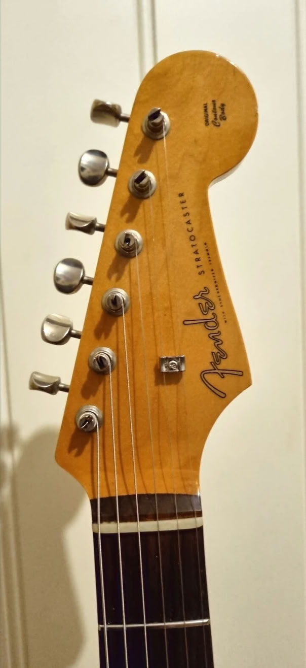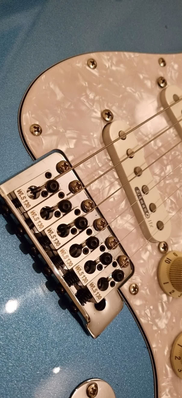 My newly refretted Fender ST-62 Japan neck (hey, Japan meets Japan) was mounted on, the tremolo was switched out to my Ping/Callaham unit from the Red Strat and i put on the Wilkinson locking saddles i had from my old Black Strat. I decided to give this a more modern feature with those. Today it has the original Tremolo with the Wilkinsons.