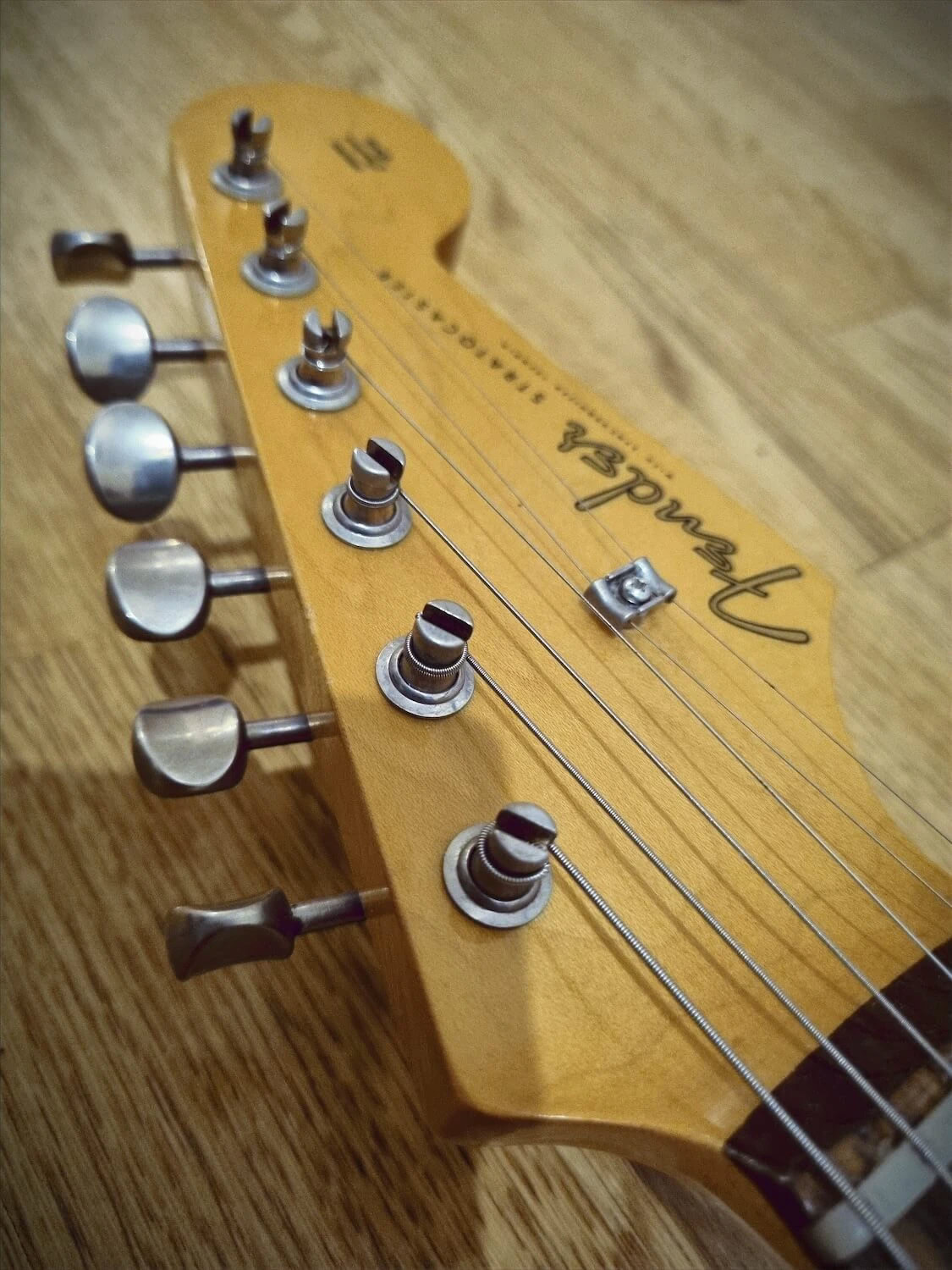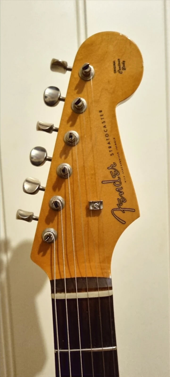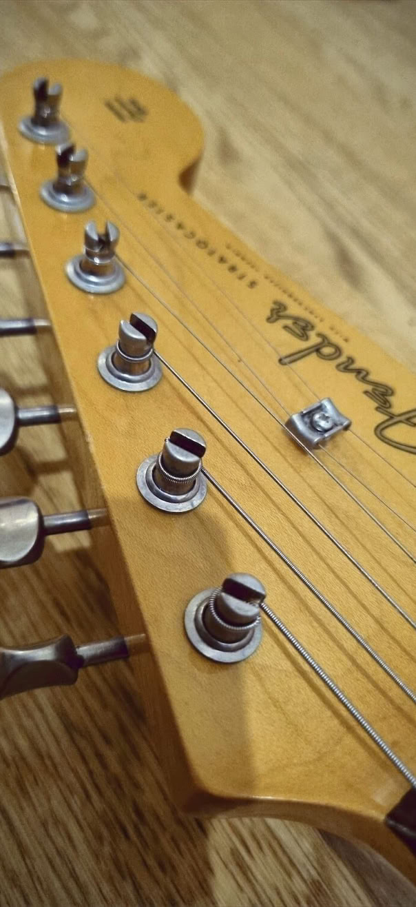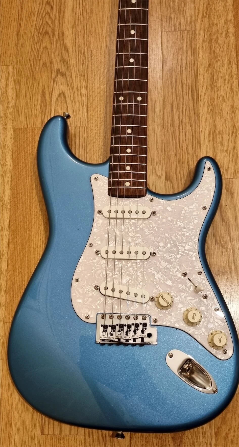 My newly refretted Fender ST-62 Japan neck (hey, Japan meets Japan) was mounted on, the tremolo was switched out to my Ping/Callaham unit from the Red Strat and i put on the Wilkinson locking saddles i had from my old Black Strat. I decided to give this a more modern feature with those. Today it has the original Tremolo with the Wilkinsons.