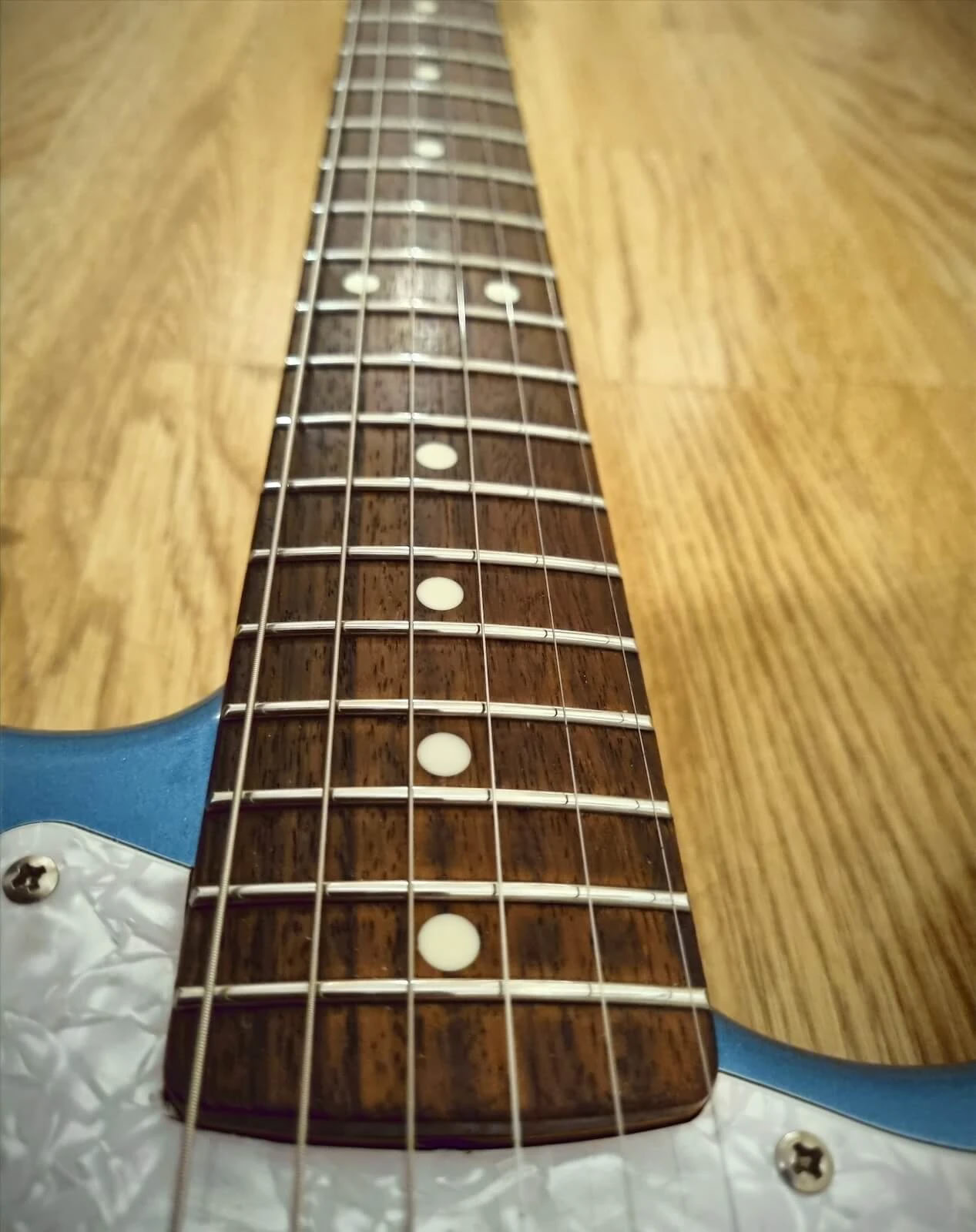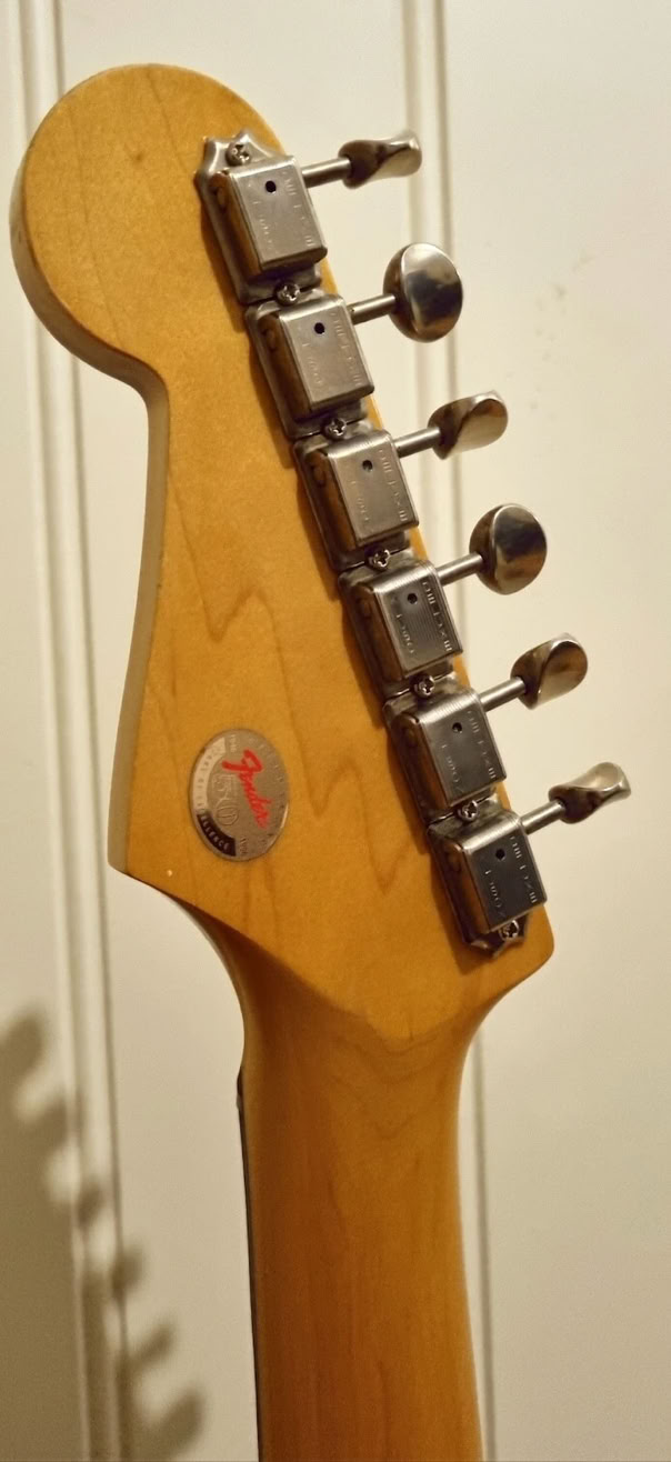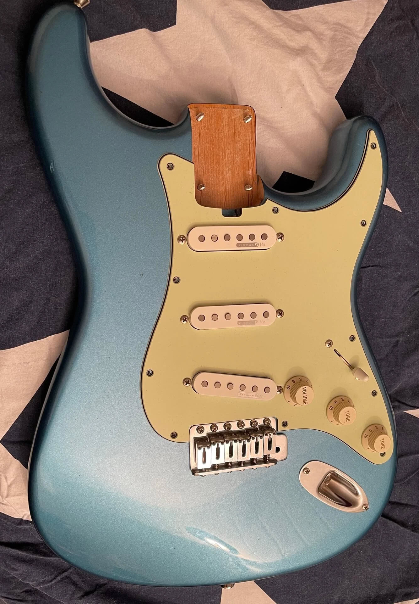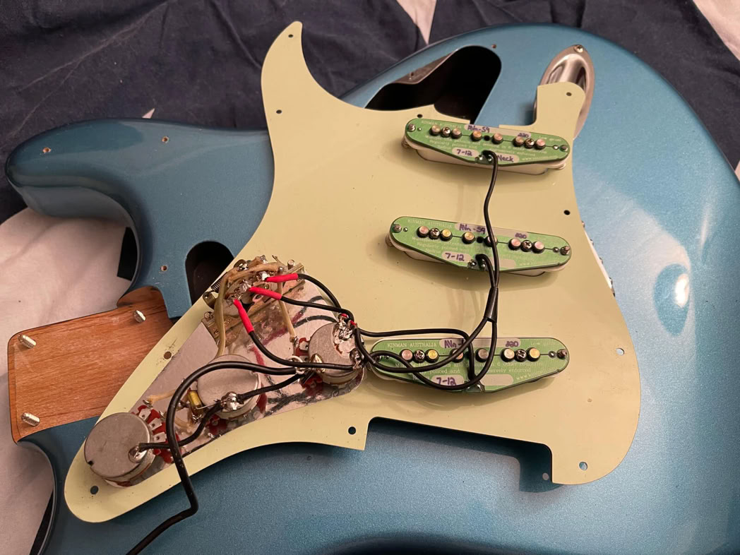 II changed the pickguard from Mint Green that it came with to Pearly white. I thought it had the best match with that color. The body was original blue-ish but age has given it a minor green tint which the camera lens stuggles to capture.i threw it together and gave it a whirl, and i was blown away by how clean those Kinmans sounded. Sweet 50s tone and super silent.