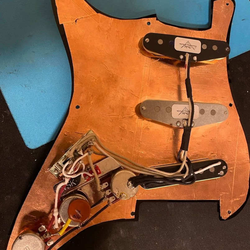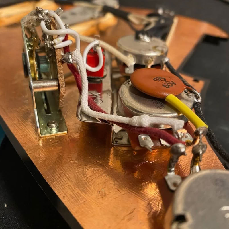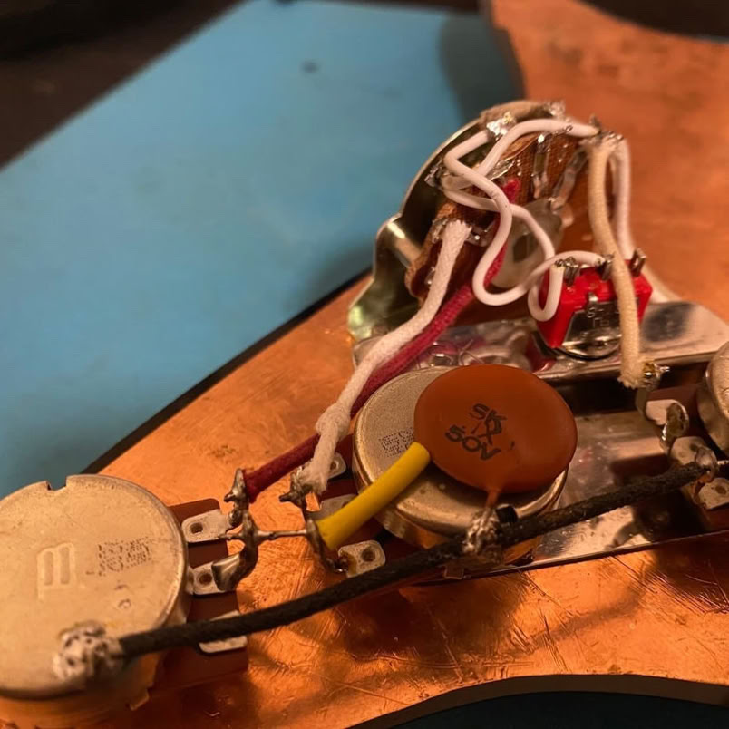 The Pickups are the only original parts left from the old build. They are the standard tone-replica issue that many seem to favor to get the Black Strat tones: Fender Fat 50's, Fender CS69 and Duncan SSL-5. The wiring started out as a Gilmour 7-way wiring kit from Hoagland custom. But i was not satisfied by the sound. It had some high-end Auricap capacitors on it and a treble bleed. I gutted the whole harness and it now has a basicLuxe 0.5mf dime cap just like Davids original and i removed the Treble bleed. Tone pots was Linear taper, which i also don't like and was switched to Audio taper. I never have got along with Linear taper pots. So there is nothing left from the Hoagland wiring apart from wires and the audio pot and the switch (which also failed and got replaced with a CRL in March 2024).