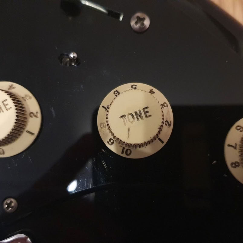 The knobs are distressed and reliced by myself to look like the original. These are basic Vintage fender knobs in aged white. I got some dark green lacquer and a thin tip pencil to add a little faux copper corrosion.
