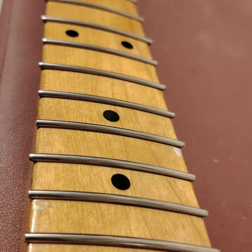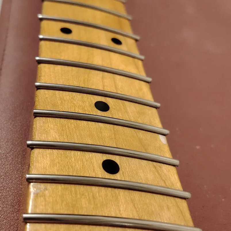 Later i purchased a Nitro Fender Classic Series 50's neck since it fits the part better in color and style. Gilmour's neck is a 1983 '57 soft-V shape with 7.25 radius and vintage style frets. And mine is now the same in the same ballpark, but it was re-fretted to Jumbo frets in April 2024. Vintage style frets is not my thing as i find them harder to bend on.