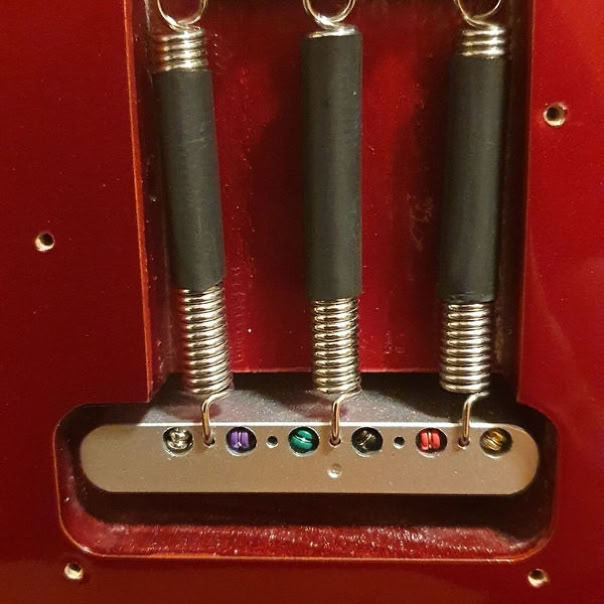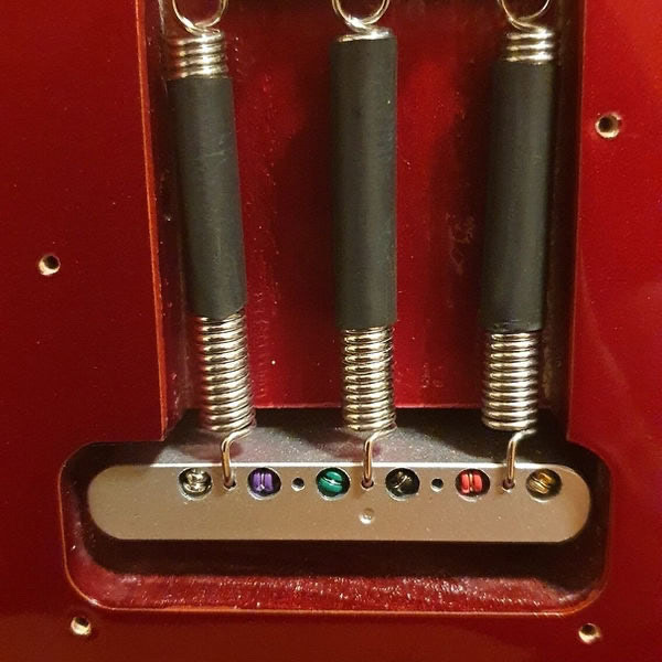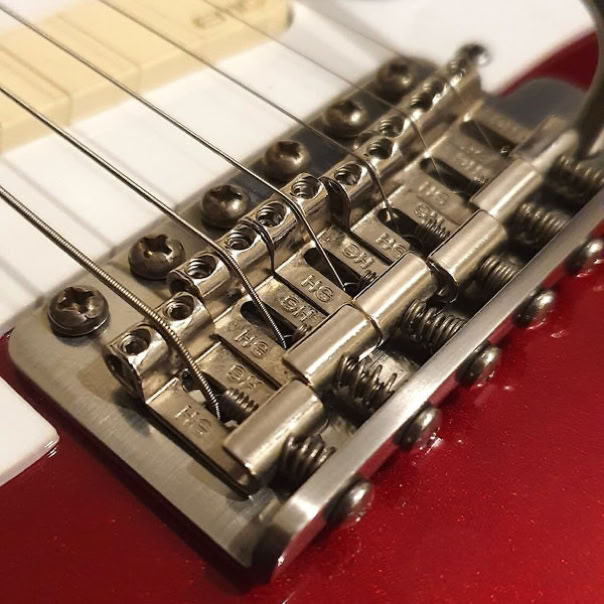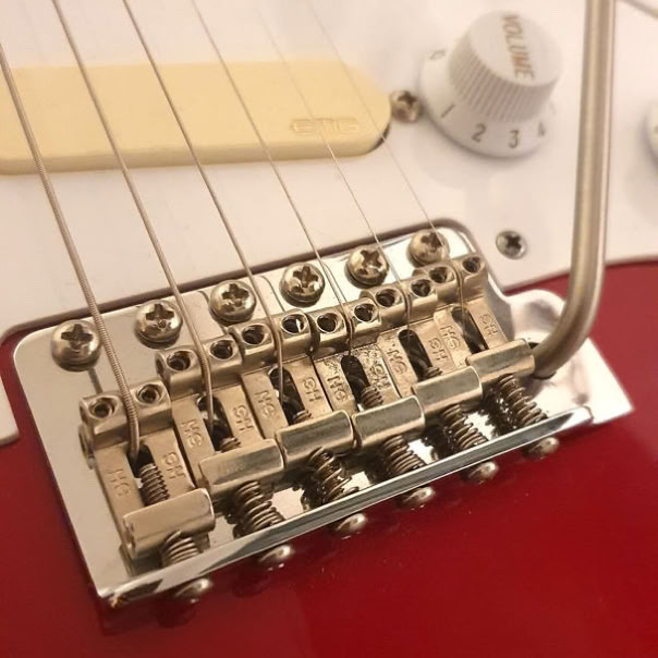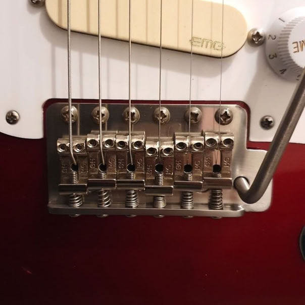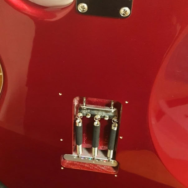 The Tremolo unit started as a regular PING block, but today it has an Callaham Tremolo Vintage Narrow with Highwood Saddles installed. The arm itself is 64" 5-1/4 length. Shorter than regular but not Gilmour short.