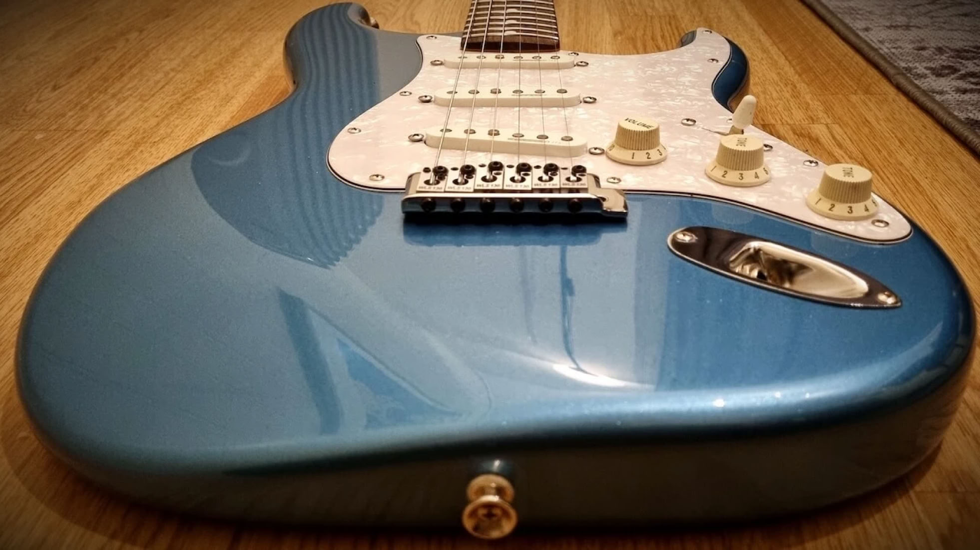 My newly refretted Fender ST-62 Japan neck (hey, Japan meets Japan) was mounted on, the tremolo was switched out to my Ping/Callaham unit from the Red Strat and i put on the Wilkinson locking saddles i had from my old Black Strat. I decided to give this a more modern feature with those. Today it has the original Tremolo with the Wilkinsons.